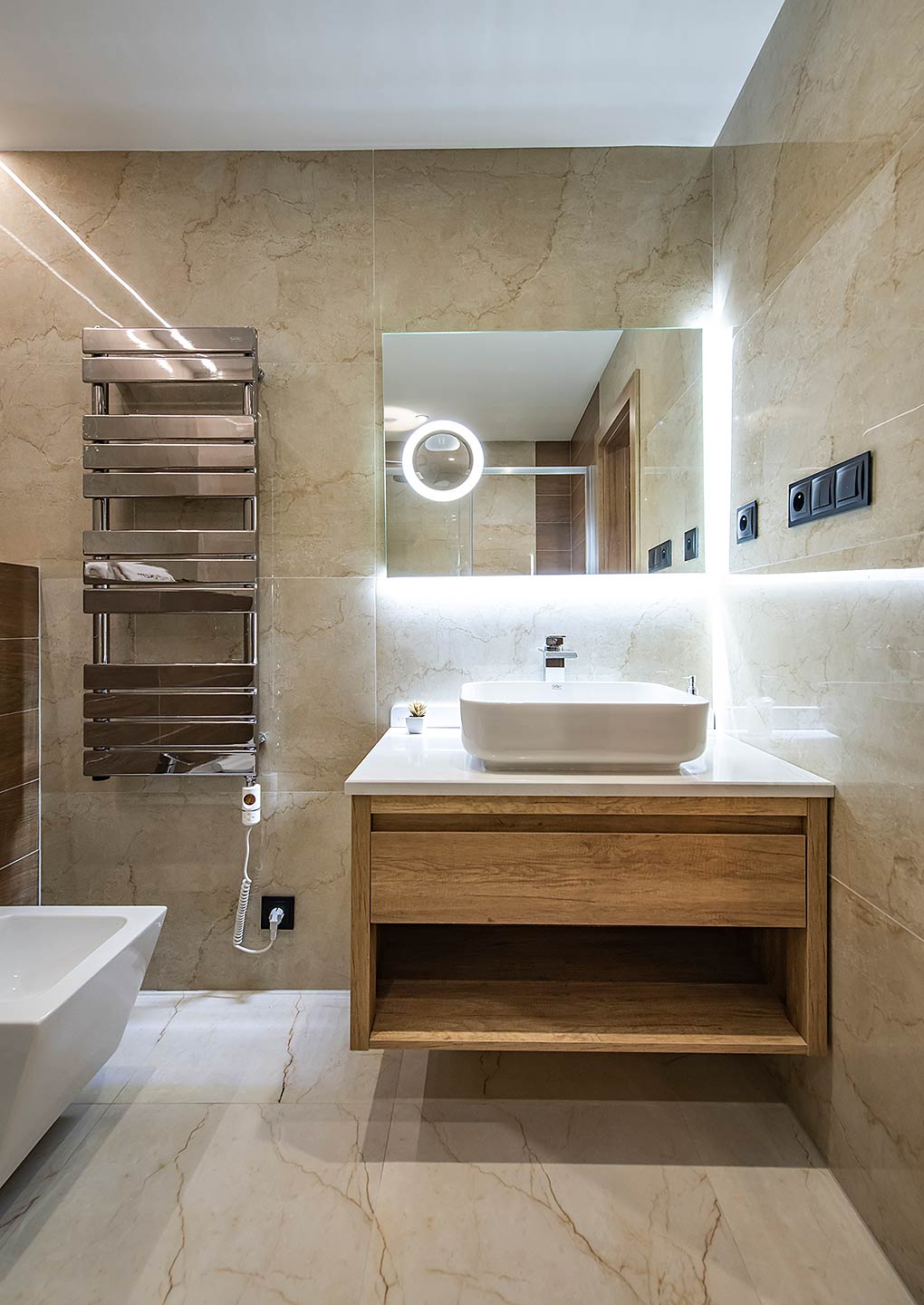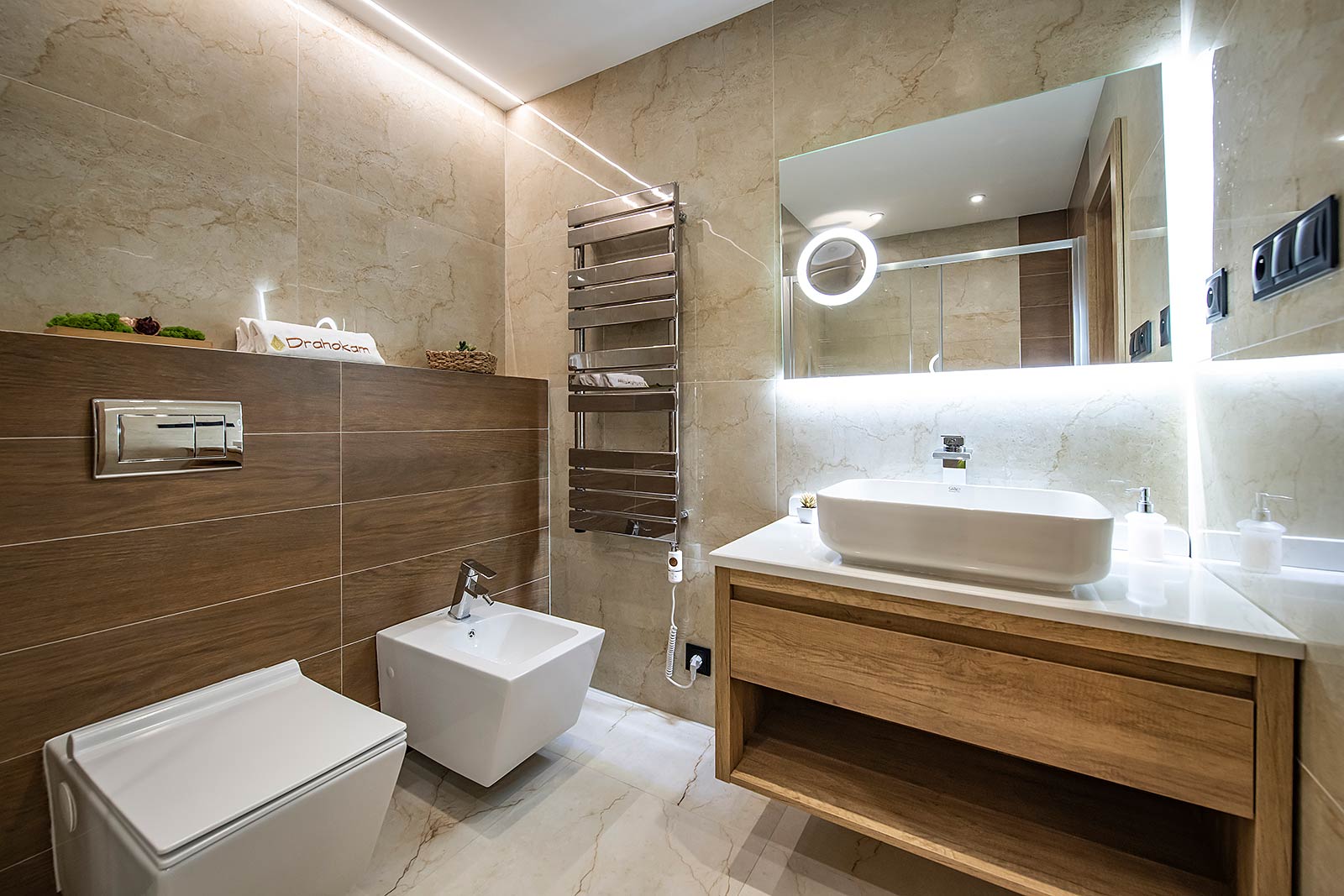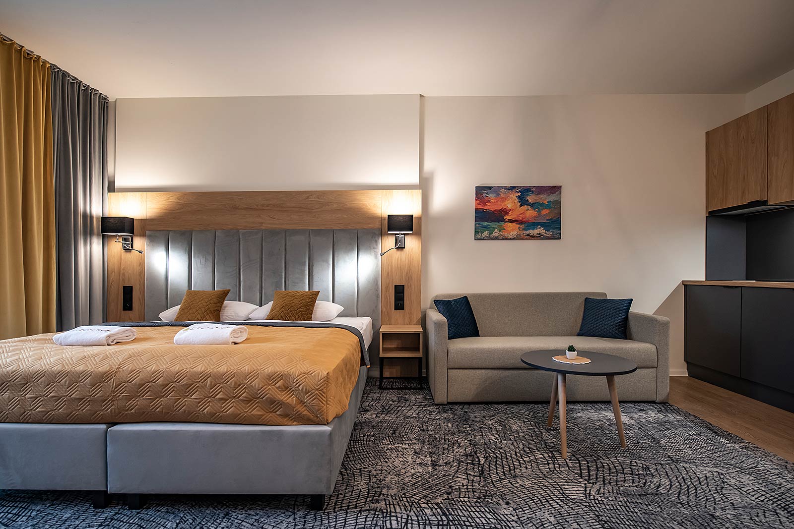 Súčasťou apartmánu je priestranný, plne vybavený kuchynský kút s elektrickou dvojplatničkou, mikrovlnnou rúrou, rýchlovarnou kanvicou a chladničkou. V kúpeľni nájdete luxusný celosklený sprchovací kút, toaletu a bidet.