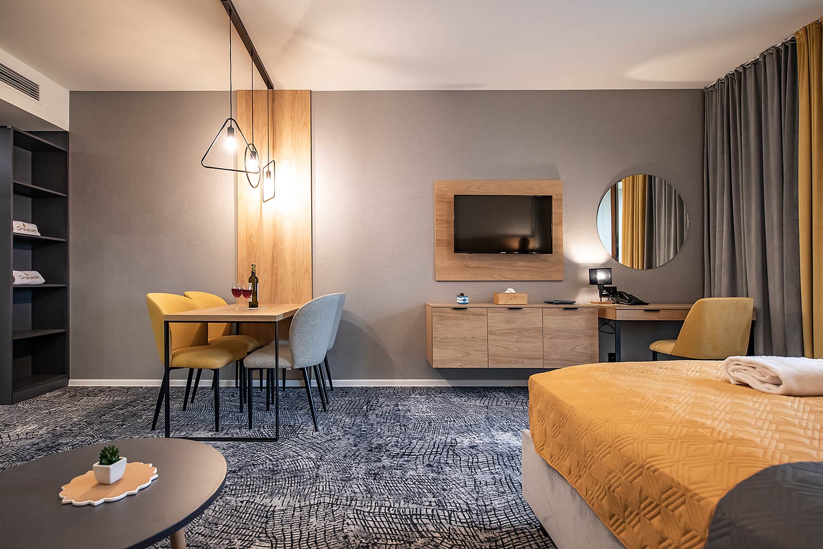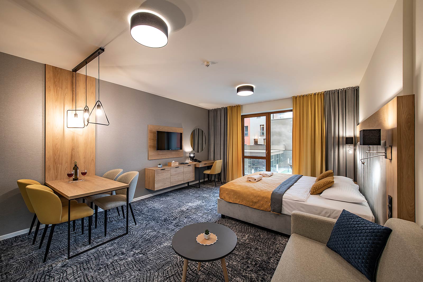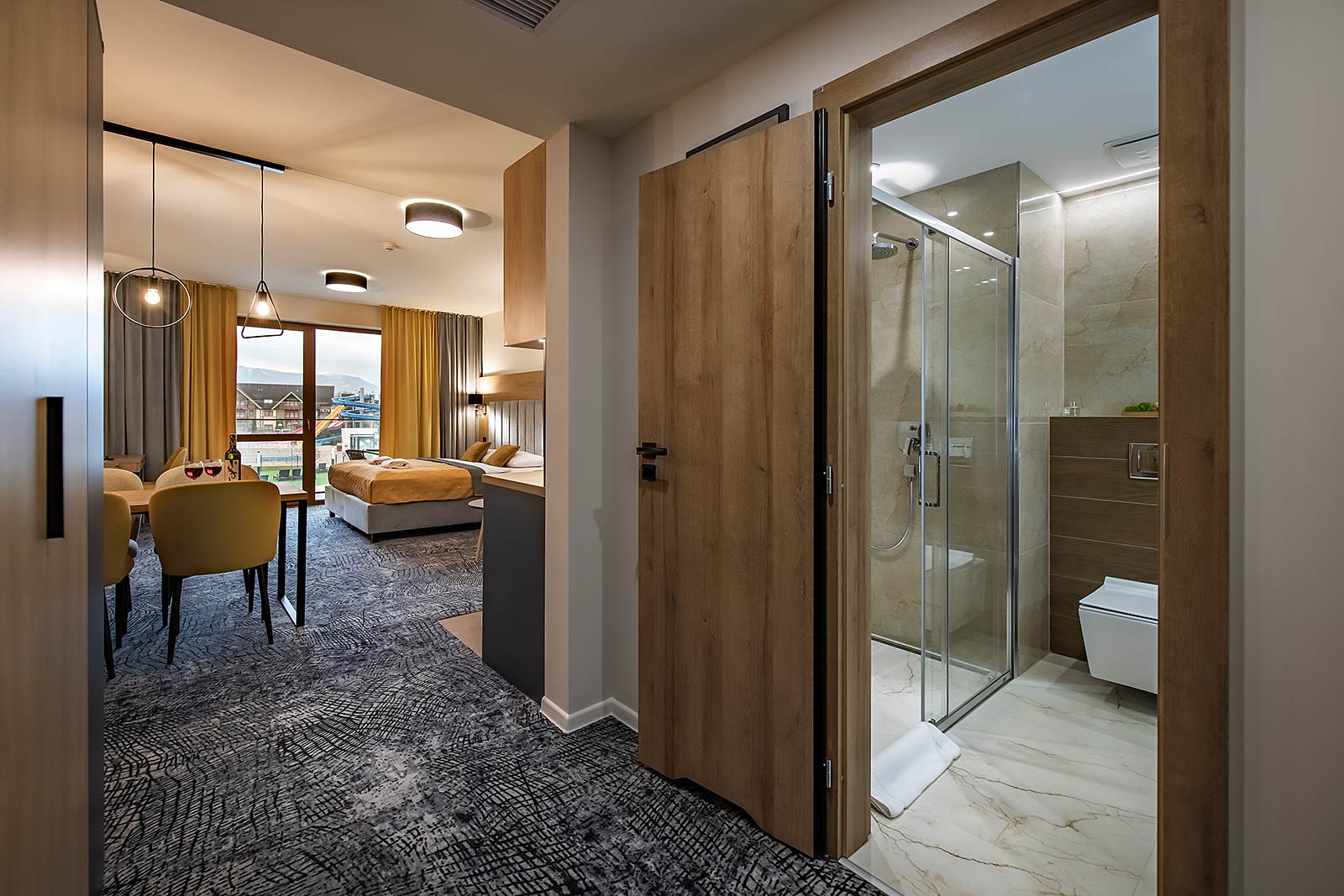 Novootvorený, moderný apartmán Drahokam v rezorte Akvamarín **** s výhľadom na hotelový bazén a vodný park, víta hostí od januára 2022. Nachádza sa na 2. poschodí s rozlohou 41 m².